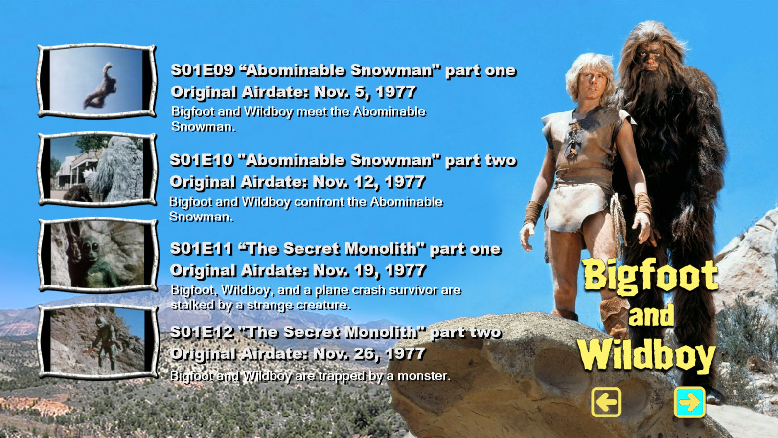 Bigfoot and Wildboy was a live action Kids series on ABC TV. It began in 1976 as a part of The Krofft Supershow on Saturday mornings. Each season one episode was 15 minutes long, with cliffhanger endings resolved the following week. It became its own series in 1979 with twelve 30-minute episodes. There were a total of 28 episodes produced.