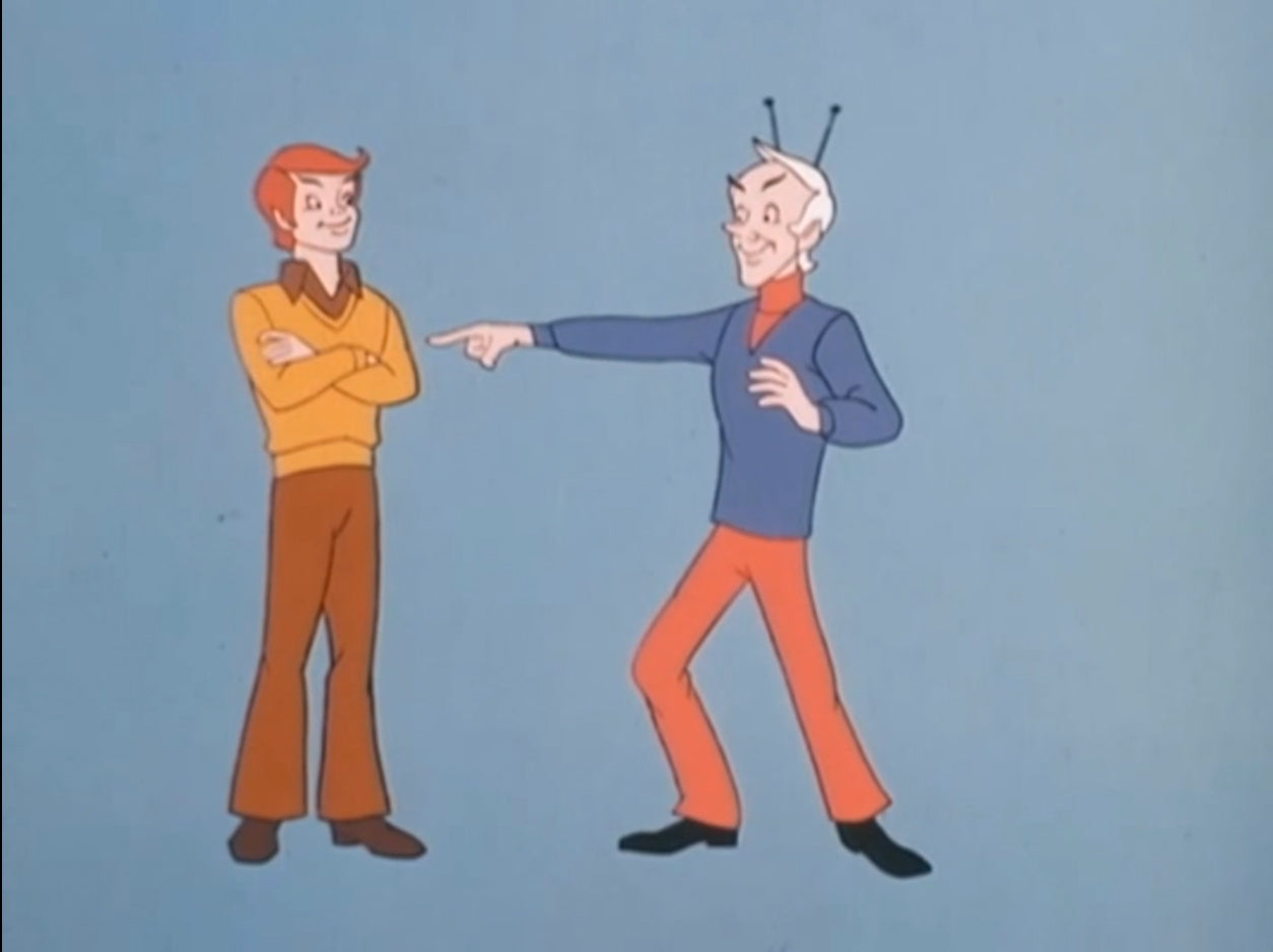 Based on the 1960’s primetime CBS sitcom My Favorite Martian, this cartoon changed the format around slightly by adding extra characters. Newspaper reporter Tim O'Hara and "Uncle Martin" were now joined by Tim's niece Katy, another antennae-headed Martian named Andromeda, and shaggy pet alien-dog Oakie Doakie.